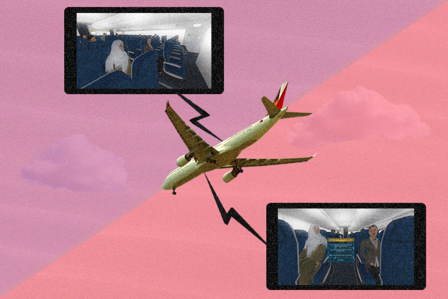 Kaip VR RPG, „On the Plane“ skatina žaidėjus prisiimti naujus vaidmenis, kurie gali būti nepriklausantys jų asmeninei patirčiai pirmuoju asmeniu, todėl jie gali susidoroti su grupės / už grupės šališkumu įtraukdami naujas perspektyvas į savo supratimą apie skirtingos kultūros. Žaidėjai bendrauja su trimis personažais: Sara, pirmosios kartos amerikiete musulmone, kilusia iš Malaizijos, dėvinčia hidžabą; Marianne, baltaodė moteris iš Vidurio Vakarų, mažai susidūrusi su kitomis kultūromis ir papročiais; arba stiuardesė. Sara atstovauja grupei, Marianne yra grupės narė, o skrydžio darbuotojas yra stebėtojas, matantis abiejų keleivių mainus.