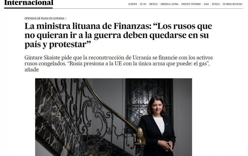 Finansų ministrė Gintarė Skaistė vienam didžiausių Ispanijos žiniasklaidos leidinių „El País“ davė interviu, pažymėdama, jog šiandien nuo mobilizacijos bėgančius rusijos piliečius reikia vertinti kritiškai ir neskubėti įsileisti į Europą humanitariniais pagrindais.
