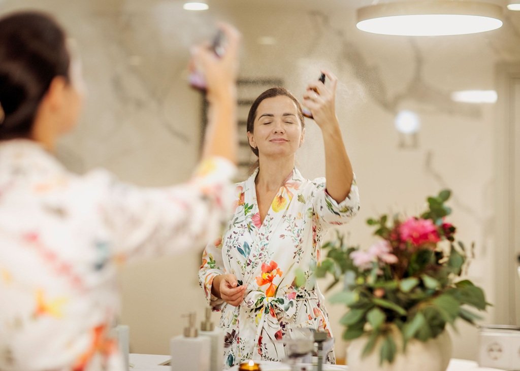 Po prausimosi ant dar drėgnos odos verta užpurkšti švelnų, odos pH neardantį produktą – hidrolatas puikiai tinka šiam žingsniui. Jis padeda odai greičiau atsigauti, lengvai drėkina ir paruošia ją kitoms priemonėms, todėl vėliau tepamas serumas ir kremas įsigeria tolygiau. Vakare drėkinantį kremą galima papildyti keliais lašais augalinio aliejaus – taip sukuriamas švelnus apsauginis sluoksnis, mažinantis drėgmės praradimą naktį.