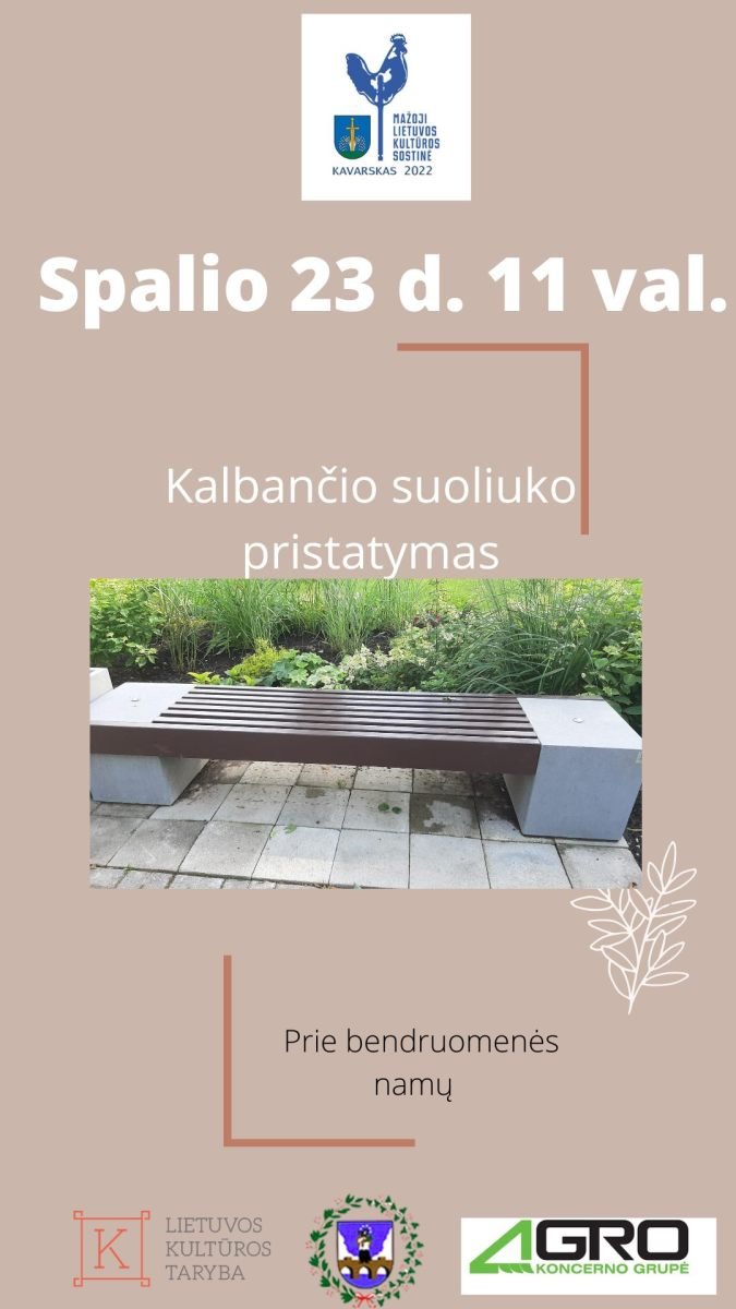 „Jau šį sekmadienį pakviesime kavarskiečius ir svečius prisėsti ant suolelio, pailsėti, galbūt pasvajoti. Paspaudus jame įmontuotos įrangos mygtuką, suolelis prabils…“ – intriguoja organizatoriai.