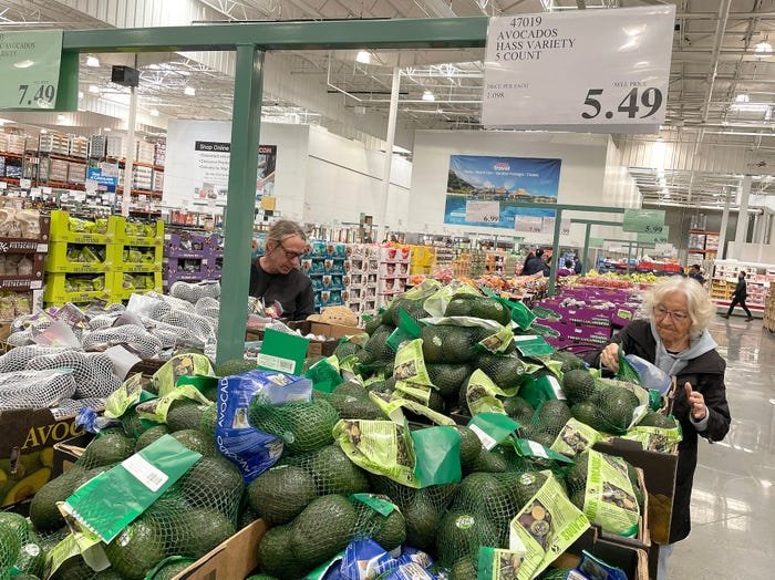 2023 m. vasario 10 d. Novato mieste, Kalifornijoje, klientai perka avokadus „Costco“ parduotuvėje. Justinas Sullivanas / Getty Images