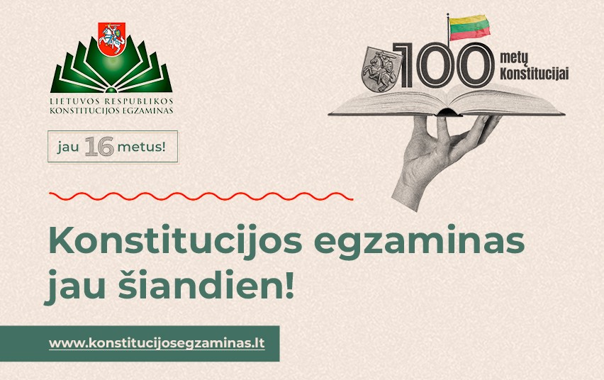 Valstybės Konstitucijos metams skirtas egzaminas, kurį sudaro 20 uždarų testo ir vienas atviras klausimas, nuo 8 iki 15 val. rengiamas internetinėje svetainėje www.konstitucijosegzaminas.lt.