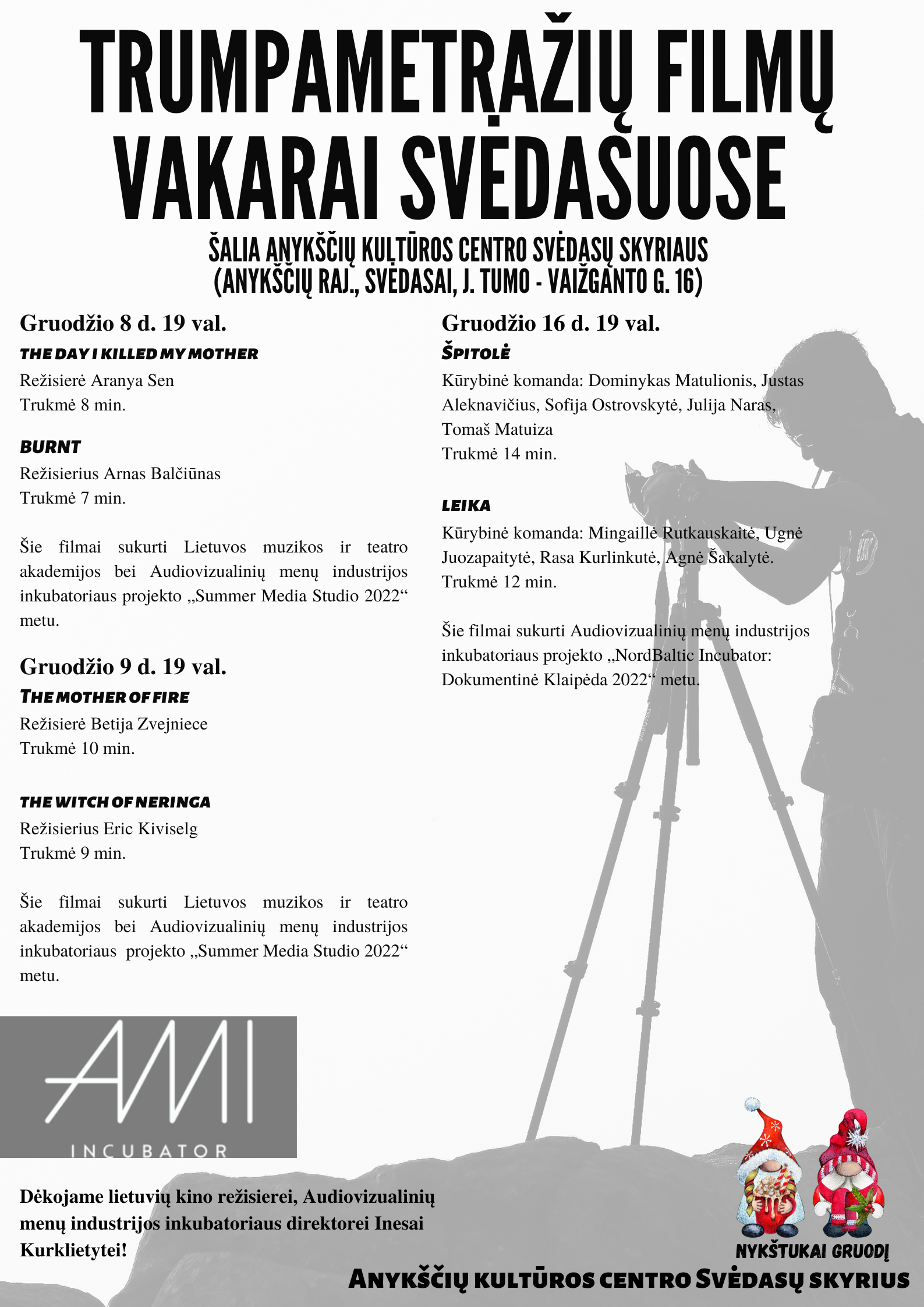 Kviečiame į trumpametražių filmų vakarus 19.00 valandą gruodžio 8, 9, 16 dienomis.
