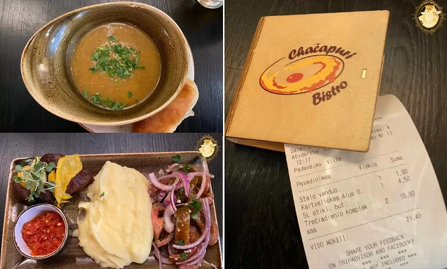 Gerai, kad bent įkalbėjau Katinienę išbandyti kažką naujo ir užsukti į „Chačapuri bistro“. Su Sakartvelo virtuve aš asmeniškai pažintį pradėjau tik atsidarius pirmiems Lietuvoje šios šalies patiekalus siūlantiems restoranams. Tad vartydamas restorano meniu aš jau svajojau apie sriubas, chačapurius ir chinkalius. Mano svajonėms išsipildyti neleido Katinienė, parodžiusi man dienos meniu ir pirštu bakstelėjusi į trečiadienio pasiūlymą, tokią iniciatyvą palydėdama trumpu sakiniu: laiko nėra, dienos pietūs, ir judam toliau.
