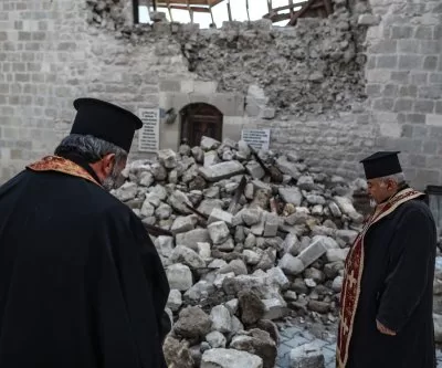 Kunigai stovi prie sugriuvusios Mergelės Marijos graikų ortodoksų bažnyčios po žemės drebėjimo Altinozu mieste, Hatay rajone, Turkijoje, sekmadienį. Erdemo Sahino/EPA-EFE nuotr