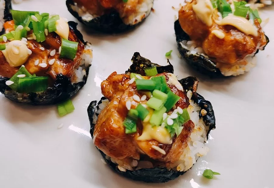 Lašiša supjaustyti kubeliais ir sumaišyti su aštriu majonezu (naudojau paprastą majonezą sumaišytą su čili padažu (Kūčių variantui galima pasidaryti naminį iš aliejaus ir avinžirnių skysčio ). Palikti kelias minutes pastovėti. Į tą laiką išvirti ryžius. Išvirtus ryžius galima paskaninti (nebūtina, nes skonio gaunama iš majonezo nuo lašišos) ryžių acto, cukraus ir druskos užpilu. Sukarpyti nori lapus tinkamo formai dydžio, uždėti paruoštus ryžius, perkelti į keksiukų formeles, o tada uždėti paruoštą lašišą. Kepti įkaitintoj orkaitėje (aš kepiaus 180°C su vėjeliu) kol gražiai apskrus (apie 15min). Iškeptus galima paglaistyti likusiu majonezo padažu ir pabarstyti svogūnų laiškais.